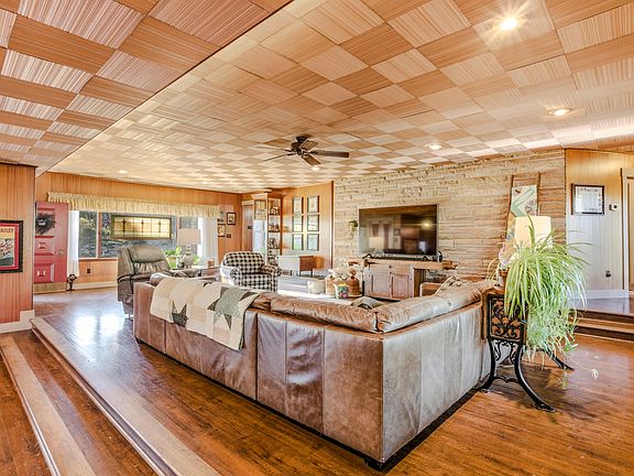 Step inside to an open and inviting floor plan featuring sunken and raised living areas, highlighted by a grand three-way fireplace that beautifully connects the living, dining, and sitting spaces. Features include: