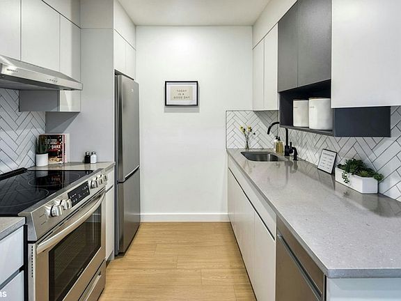 Each kitchen provides a contemporary design backdrop with practical storage. Finished with custom Lacquer cabinetry and Arctic-White subway tile backsplashes that are beautifully paired with polished Caesarstone Quartz countertops. A full suite of stainless steel appliances is ideal for at-home gourmands. Additional features include in-unit W/D's and expansive windows that provide for an abundance of natural light.