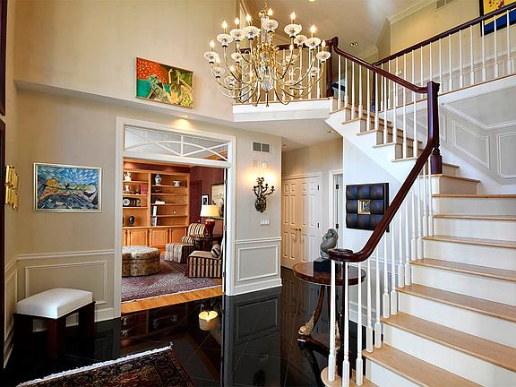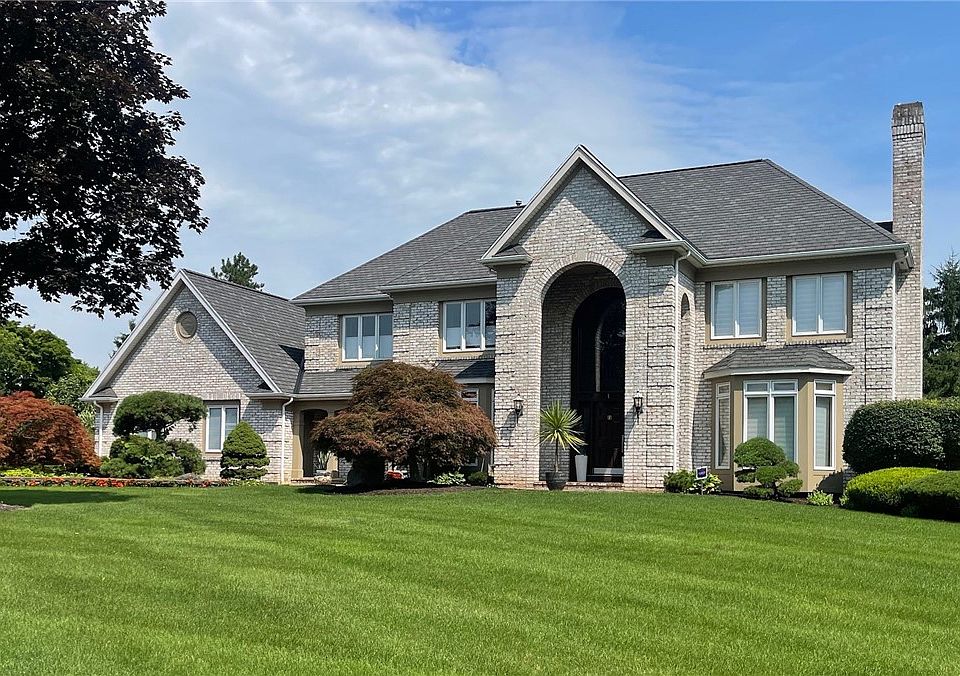 The Manors — an exclusive community of 16 stately, custom-built homes in a sought-after area of Pittsford. This finely crafted residence was designed by well-known regional designers. The home offers a blend of classic and modern designs, architectural features, and millwork, along with a private outdoor space with patios and a pool. The grand foyer is highlighted with Absolute Black granite flooring, one-of-a-kind crafted Nancy Gong glass doors, and detailed moldings. The two-story family room, with its Brazilian Cherry flooring and expansive windows, is highlighted by a floor-to-ceiling angled European tile wall with a built-in horizontal gas fireplace. The kitchen seamlessly connects to the family room, formal dining room, and a large patio overlooking the resort-style grounds. The formal dining room is highlighted with a Swarovski Crystal Globe chandelier and a gold-leafed tray ceiling. The living room blends classic design features and elegance, with custom moldings throughout, a wood-burning fireplace and a bay window. A private study/library with French doors and built-in bookcases provides an ideal environment for remote work or quiet space. Upstairs, the entire second floor features tongue-and-groove hardwood flooring and four spacious bedrooms with three full attached baths. Each bathroom has been renovated with high-quality finishes, including European marble. The Primary Suite features a tray ceiling and a luxurious en-suite with whirlpool tub and dual sinks with a waterfall quartz countertop. Attached to the Primary Bath is a custom-built cherry walk-in closet and an additional cedar closet. Each bedroom has direct access to a full bath. Outside, the grounds include an underground, automatic, zoned irrigation system, a stunning gunite pool, multiple brick patios, and a fully fenced yard. A home of this caliber, in such a private and desirable Pittsford location, is truly a rare offering. **Delayed Showing begin Friday, Oct 3rd at 9 am. Delayed Negotiations, Friday Oct 10 at 2 pm**. Some of the furniture is available and may be purchased separately.