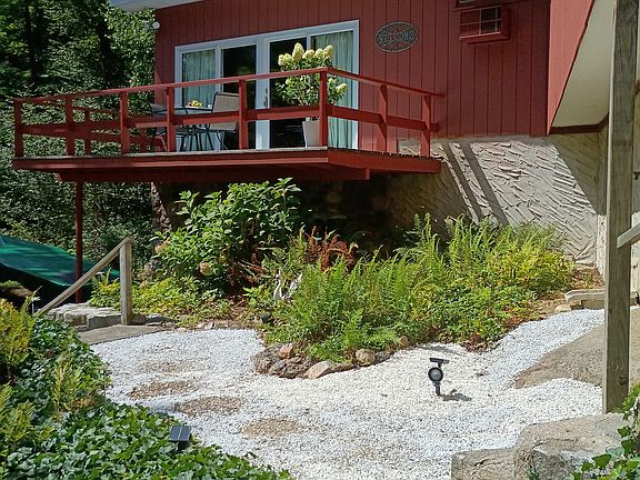 Fieldstone wood burning fireplaceStreet frontageCrown moldingGood sized decksSeasonal lake viewsLarge lotAmple levelish parking