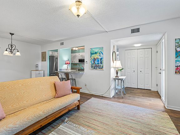 Welcome home to this spacious first floor condo! Lovely LVP flooring and nice appliances inside! This home has two bedrooms and 2 bathrooms with a large enclosed lanai! There is a an open living/dining kitchen layout. Access to Conquistador amenities include 3 pools (one heated), tennis and pickleball courts, beautiful walking areas, car wash station, grilling areas and covered pavilion. Nearby there is the Riverview Club with Olympic size pool, nature trails and fishing pier on the Intracoastal and The Shores Golf Club. Shopping and area beaches are less than 10 minutes away.