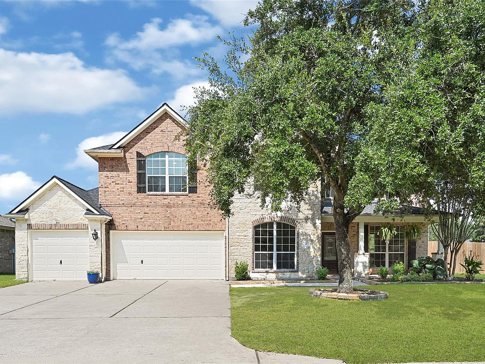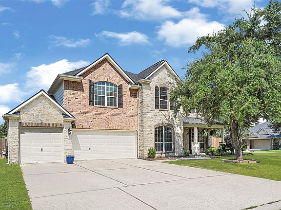 Welcome to this elegant corner-lot residence where timeless design meets modern comfort. Situated on a fully fenced lot w/ a 3-car garage, this spacious 2-story home offers 4 bedrooms, 3.5 baths, & a resort-style backyard w/covered patio, fire pit area, & private pool—perfect for entertaining or relaxing. Inside, enjoy soaring vaulted ceilings, a curved staircase, custom built-ins, & generous living spaces. The chef’s kitchen features granite countertops, a copper farmhouse sink, breakfast bar, abundant cabinetry, & an oversized island. The 1st floor includes a private study, a luxurious primary suite w/ a fireplace, walk-in closet, double vanities, & spa-like bath. A charming sitting room w/piano sits adjacent to the formal dining area. Upstairs offers 3 spacious bedrooms, a large game room with pool table, & a dedicated media room. Updates: new paint & carpet (25'), roof & tankless water heater (21'), HVAC (22'), updated pool equipment, and Wi-Fi-enabled sprinkler and pool systems.