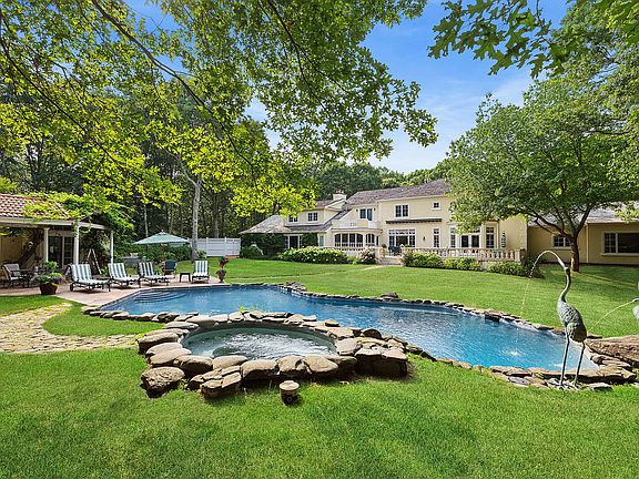 Slate terraceDouble stone waterfallHartru tennis courtCurved staircaseHeated gunite poolThree-bedroom suiteGuest cottages
