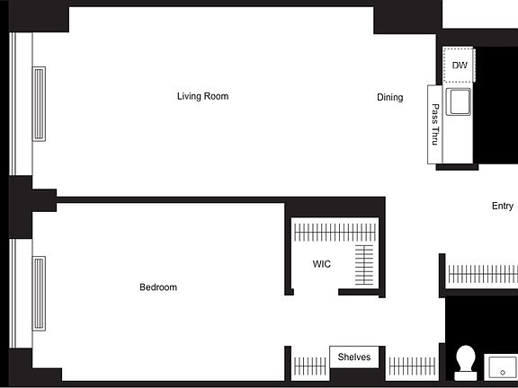 Spacious 1 Bedroom, 1 Bath with upgraded strip wood flooring, solar shades, a gourmet pass-through kitchen, high ceilings, and Union Square Park views.
