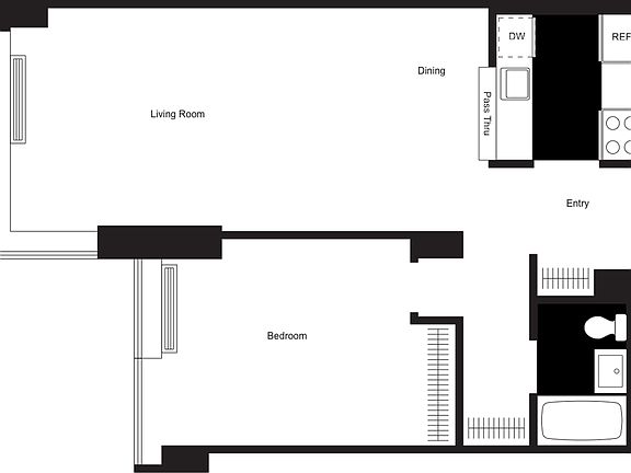 Oversized 1 Bedroom, 1 Bath with a gourmet pass-through kitchen, floor-to-ceiling windows, northern exposure, spacious closets, upgraded strip wood flooring, and solar shades.