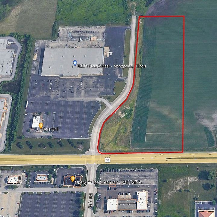 This prime retail development opportunity is located at the northeast corner of US Route 30 and 5th Avenue in Montgomery, Kendall County, IL. The site consists of approximately 15 acres, with the flexibility to subdivide down to parcels of roughly one acre, making it highly adaptable to a range of users. With nearly 1,400 feet of frontage on Route 30 and traffic counts of 26,000 vehicles per day, the property offers excellent visibility and exposure in a strong growth corridor. Access is superior, with a signalized intersection, dedicated turn lane, and curb cut on 5th Avenue. Zoned B-2 Regional Business, the property is ideally suited for gas stations, convenience stores, car washes, fast food with drive-thru, medical facilities, and other retail or service uses. Sewer and water are available to the site, and the property benefits from inclusion in a TIF District, offering potential development incentives. Pricing is variable depending on the parcel selected. Parcels may be purchased in bulk or individually, and joint venture opportunities may be considered on a case-by-case basis. While portions of the property fall within a floodplain, mitigation options are available, ensuring the site's long-term development potential. Some fill is required to bring the property to grade, but the seller will cooperate or may fill the site to the buyers specifications. This is an exceptional opportunity to secure a high-traffic, signalized corner with outstanding visibility and flexible development options.