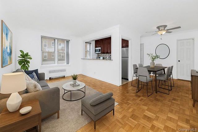 BOARD APPROVAL REQUIRED. Welcome home to a beautifully updated 1 bed, 1 bath unit in the well maintained Vincent Arms complex. This unit features a dining area and spacious living room with breakfast bar. The modern kitchen offers granite countertops, stainless steel appliances, and recessed lighting. The bedroom includes two closets, one a walk-in, plus remote-controlled blinds for convenience and an adjacent updated bathroom is finished with elegant travertine marble. Building amenities include a common laundry room on the ground level and a live in superintendent. Enjoy the park right across the building entrance providing a perfect outdoor retreat with sitting area, playground, and basketball court. Ideally situated near Fleetwood & Bronxville Metro North stations, Bee-Line bus stops, Bronx River and Cross County Pkwys, Cross County Mall, and Bronxville Village. A comfortable and stylish home in a desirable location! (Listing 7194280 Confirmed 9/30/2025)