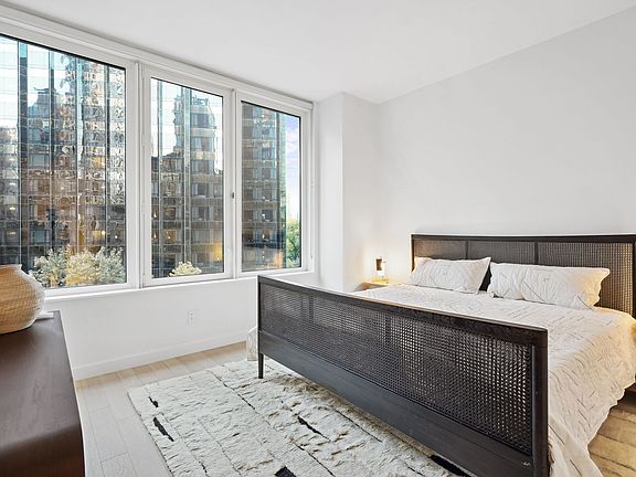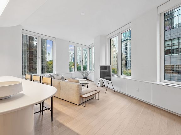 Amazing 3 bedroom with unique corner living room featuring soaring 7-foot tall windows showcasing Columbus Circle views. This spacious apartment features an oversized open gourmet kitchen with Italian cabinetry, a unique curved Caesarstone island, and Wolfe appliances. The primary bedroom boasts a walk-in-closet and en-suite bath richly appointed in terrazzo with radiant heated flooring, custom double vanity, and a glass enclosed shower. The apartment also includes a powder room, an in-unit LG washer/dryer, wood floors, and high ceilings.