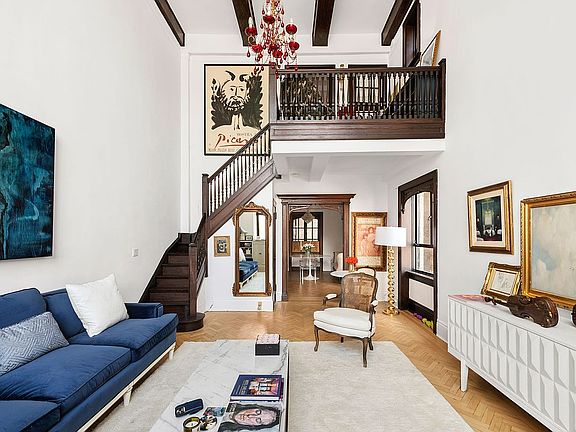 A truly rare two-story Parisian-style atelier resplendent with original details is located in the iconic Hotel des Artistes. High on the 9th and 10th floor, this home has beautiful herringbone hardwood floors, an elegant and detailed oak staircase, ornate oak door and window frames as well as 18’10" beamed ceilings, all adding a turn-of-the-century charm. With breath-taking open city views via 2 exposures, north and west, this home is sun-kissed. You enter through a formal windowed dining room with a separate kitchen. Then the home flows graciously into an expansive living room with 14’ windows framing an amazing open sky and northern city view. Up the sweeping staircase, you first enter a spacious landing with built-in shelving, suitable for an office or a library or just a place to enjoy the city view. The adjoining bedroom with two exposures providing west and southern light has a walk-in closet and ensuite bath.