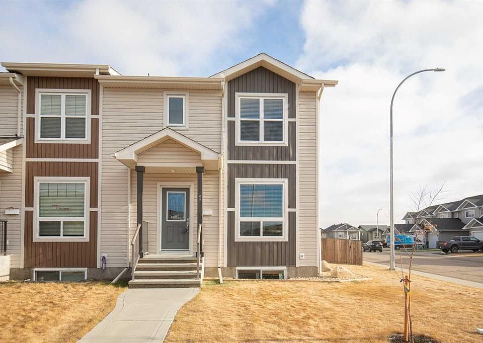 Immaculate end unit townhouse, with the largest yard of all of these townhouses! Built by True-Line Homes, this home was built with quality and pride, all of the final touches have been done to make this home move in ready!. 3 bedrooms, 3 baths it features a gorgeous kitchen, large living area, Large Primary Bedrooms with Walk in Closet and 3 Piece ensuite!. This home has the largest yard of the entire street of townhouses! - Room for a Double Garage!! Fully fenced with large deck and backs onto a back alley leading to the parks, walking paths and more. In One of the best Blackfalds Communities!