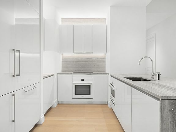 Move In Ready! Residence 704 is a unique layout within One Wall Street. 704 is an oversized two bedroom and two bath home. Located in the South/East corner of the building, this home offers natural light, and ample closet space. Custom kitchens and baths pair seamless technology with classic elegance. The Kitchen features Oceanwood marble slabs which rests on custom Aran Cucine cabinetry, accented by white glass panels and satin nickel finishes and is the perfect blend of beauty and function.