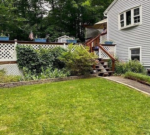 Located on a picturesque country lot you will find a gleaming raised ranch with plenty of space for family & friends. Generously size bright & sunny kitchen outfitted with lots of cabinets & counter space. Additional bonus dishwasher, stove and refrigerator are part of the sale. Adjoining the kitchen is the dining area featuring lighted ceiling fan & hardwood floors and bay window overlooking the gardens. Just outside the dining room is a 2 level 36x12+ deck just perfect for barbequing. The living room is enhanced with a impressive stone fire place & another ceiling fan. Down the hall are 3 impressive bedrooms and a bathroom that has been completely remodeled. New everything is new from floor to ceiling. Hardwood floors flow throughout the upper level. Headed down to the lower level is a play room , laundry hook-up plus 2 additional rooms. Some additional features : generator hook-up, freshly painted rooms & pull down stairs to attic. Minutes to Rt101 which takes you to Manchester or Portsmouth. Showings will start on July 21 by appointment All offers to be submitted by July 24th.