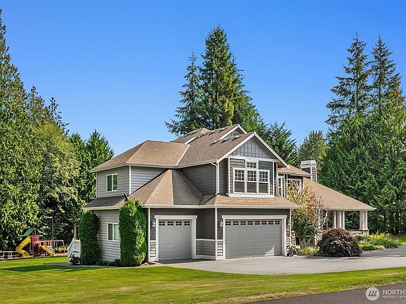 Beautiful home on a stunning estate sized lot. Landscaping frames the gorgeous home and the deck that goes for days. Entry welcomes you to a light filled home with a great room and kitchen meant for making memories. Great room opens to the spectacular yard, climbing toy, and fire pit. Spacious living room with fireplace and a dining room for the holidays. An office that is great for work from home and has room for 2 desks. Huge bonus with vaulted ceilings ready for sports and movie viewings. Primary has a nook for relaxing and a luxurious bath. 4 additional spacious bedrooms and 2 are en suite. Three car garage with spacious shop space. Lake WA schools. Meticulously cared for by original owners, the home is spotless.