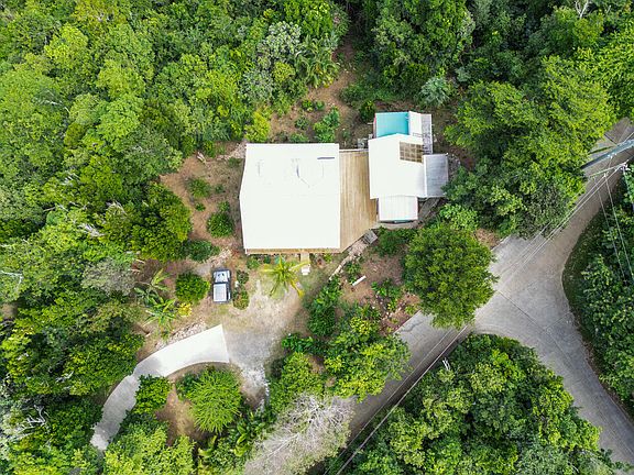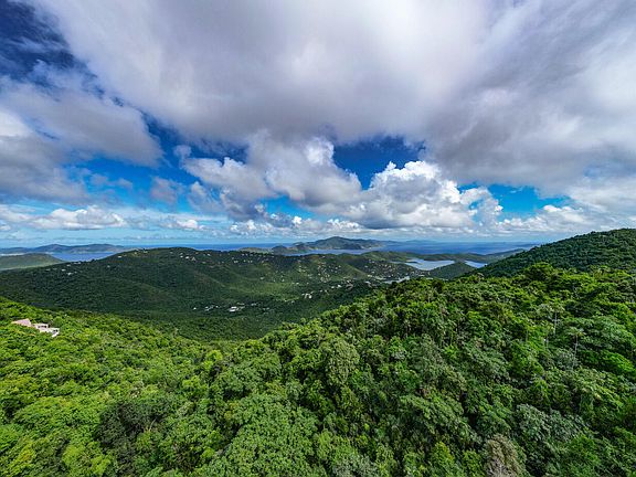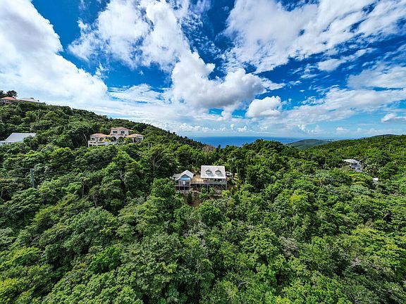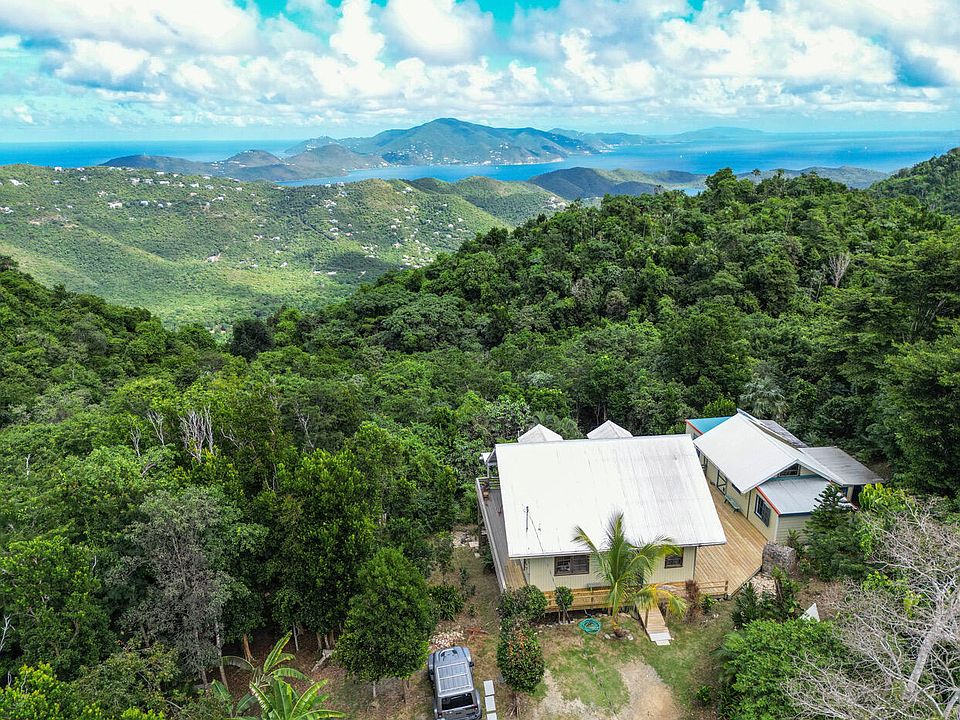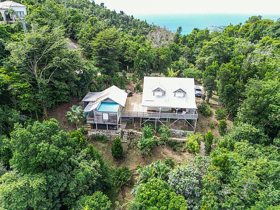 Enchanted Garden sits atop lush Bordeaux Mountain and is a true haven for gardeners, surrounded by mature fruit trees, ornamentals, native flora, and signature Bay Rum trees. The main home features a full wraparound deck--both covered and open--capturing cooling breezes and serene water views. The accessible main level offers an open living area with kitchen, dining, living room, bedroom, and full bath. A spacious loft above includes an additional sleeping area and half bath. Across the expansive deck, a charming one-level guest cottage provides its own kitchen, dining, living area, bedroom, and full bath. Down below, a screened garden guest room offers a peaceful retreat immersed in nature.