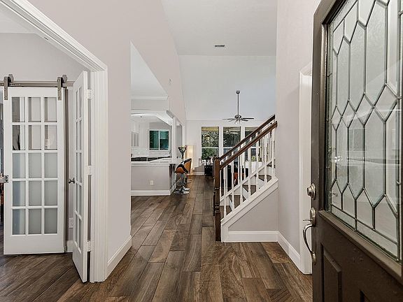 Stunningly remodeled home on a large, private lot that backs to a lush greenbelt in Alden Bridge! Extensive wood-look ceramic tile flooring, fresh interior paint, replaced 2 a/c units, new water heater, added side patio, new designer light fixtures, and so much more! Fabulous kitchen renovation with quartz counters, all new cabinets with lighting, Pex piping, built-in Thermador espresso machine, 40 bottle capacity wine chiller, drawer microwave, Bertazzoni gas range, and Miele dishwasher. The kitchen opens to the breakfast and family rooms; the study with pocket doors is the ideal work from home space; formal dining (or flex space); primary bedroom suite down with brand new shower; three bedrooms and game room up; two car attached garage; home is wired for a portable generator; huge fenced yard with covered patio and wood deck with built-in seating, vegetable gardens and plenty of grassy area to play!