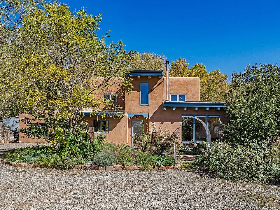 High desert permaculture oasis! 3-bedroom, 2-bath, 3066 square foot home, with large bonus room with it's own entry that could serve as studio, office, or another bedroom, nestled in towering cottonwoods on three lots totaling almost 18 acres along the lower Arroyo Hondo, with an intermittent spring and a year-round pond. This working permaculture farm produces nursery stock and landscaping plants, as well as generous amounts of food for family and friends, with a chicken coop, two 360 sq. ft. hoop houses and roughly 8/10ths of an acre in cultivation, including gardens and fruit trees. Set up for energy efficiency, with owned solar panels, a greenhouse attached to the house for ample solar gain, rainwater catchment, the house provides year round comfort. Inside, the main living area features high beamed ceilings and plaster walls, a cozy high-efficiency wood stove, and Saltillo tile. The kitchen features stainless steel appliances, the bathrooms have been recently updated, and the primary suite opens to a second story deck to take it all in. Sellers have done substantial recent work to decks, stucco, windows and roof. All of this less than three miles from city limits and a quarter mile from Ojo Santa Fe.