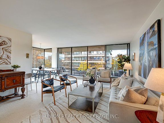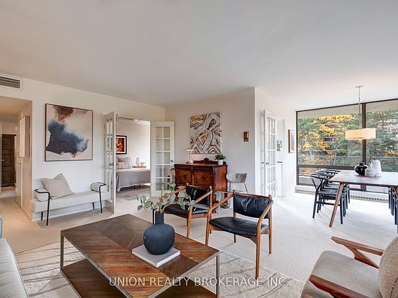 A truly unique and iconic mid-century modern co-op, originally developed by the founder of the Four Seasons Hotel in 1969. This stunning corner suite offers over 1,100 square feet of interior living space, complemented by an impressive 482 square feet of outdoor living space on a wrap-around balcony with north, west, and south views. The suite features an open-concept living and dining area with floor-to-ceiling, wall-to-wall windows, maximizing natural light and views. The spacious primary suite includes an ensuite bathroom and ample closet space. The second bedroom, which offers a walkout to the balcony, opens to the living room via elegant double French doors. This is a fantastic opportunity to remodel and customize the suite to your exact specifications. Located just half a block from Yonge Street and the TTC, the property offers urban convenience with tranquil surroundings. Shopping, dining, and entertainment are moments away. For nature lovers, David Balfour Park and the attached ravine offer a paradise of interconnected trails for hours of hiking. Alternatively, you can relax on your huge balcony and enjoy the peace and tranquility of the surrounding gardens. Residents also have access to a fabulous outdoor pool and beautifully maintained mature grounds. The Sellers, who have lived here for 30 years, have enjoyed every moment in this oasis of quiet, calm and natural beauty.