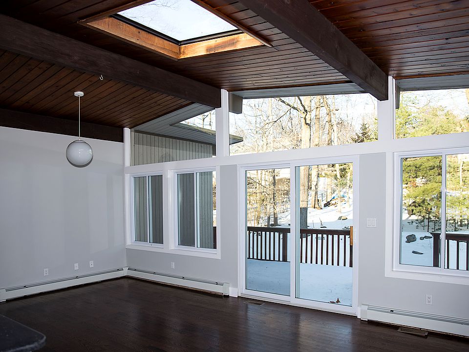 Do you love contemporary style houses? This is the one for you! CONTEMPORARY STYLE RANCH, in a private setting. Some of the house features include: Stained hardwood floors throughout, custom oversized windows for lots of natural light, beautiful stained exposed beams to add character to this lovely home, sun lit living room with skylights and sliding doors leading to a private cozy patio, spacious light filled dinning room with wood burning fireplace, heating system 2 years old, high efficiency boiler and hot water heater, additional heated room with ceramic tiles for multi purpose use. Make this your home!!