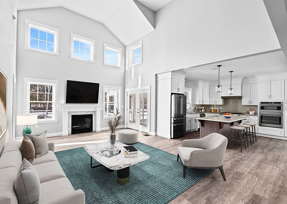 Composite deckingFirst floor primary suiteCathedral ceilingsOpen floor planHardwood flooringKohler plumbing fixtures