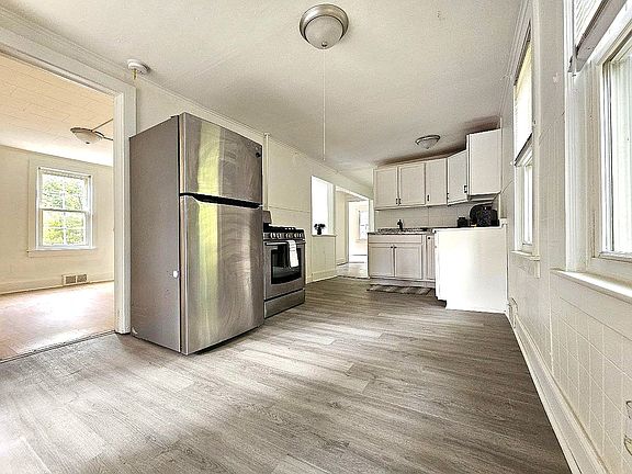 Light fixturesSpacious bright enclosed porchUpdated bathroomWarm hardwood floorsWood-toned flooringNew vanityDining space