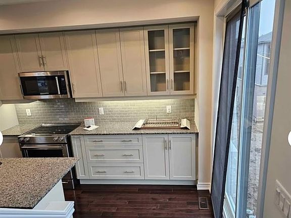 Natural lightModern kitchenStylish backsplashGranite countertopsNew appliancesBeautiful hardwood flooringPrivate backyard