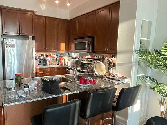 Aria', 9Ft Ceiling. Bright Unobstructed East Exposure With Very Large Private Balcony, Minutes To Subway, Restaurants, Excellent Facilities, Party Room, Game Room. Fitness Centre, Indoor Pool. Guest Rooms And More. Extras:All Elf's. Stainless Steel, Fridge, Stove, Built In Dishwasher. Stacked Washer And Dryer