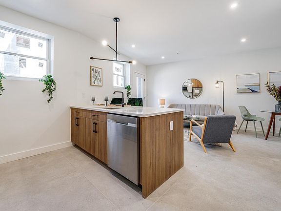 Design and detail emulate throughout with concrete slab floors for unit 101, extra large windows, and matte black fixtures throughout. Kitchens showcase eat-in white quartz countertops and backsplash, modern custom cabinetry, and stainless Samsung appliances, all ideal for everyday living and entertaining. Tranquil bathrooms bring floor to ceiling porcelain tile, glass showers and soaker tubs, and carefully curated fixtures and fittings for style and ease. Select units offer a two-story floorplan complete with soaring ceilings and illuminating oversized windows.