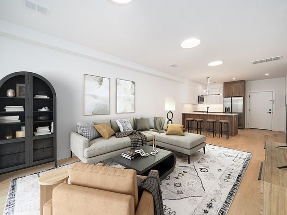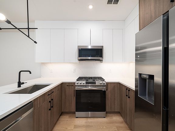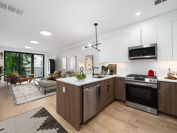 Design and detail emulate throughout with light oak hardwood floors, extra large windows, and matte black fixtures throughout. Kitchens showcase eat-in white quartz countertops and backsplash, modern custom cabinetry, and stainless Samsung appliances, all ideal for everyday living and entertaining. Tranquil bathrooms bring floor to ceiling porcelain tile, glass showers and soaker tubs, and carefully curated fixtures and fittings for style and ease. Select units offer a two-story floorplan complete with soaring ceilings and illuminating oversized windows.