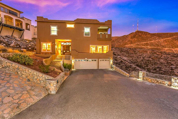 Enjoy the fabulous views of the Franklin Mtns and the city lights of two cities and 2 countries. This 5 bdrm multi-level home sits at end of a cul-de-sac in the gated and guarded community of Sierra Crest. Close to the hospitals, university and downtown. Home features 5 bedrooms plus an office/library Breakfast area with an Island. Multiple balconies to enjoy the cities' view. it has a 3 Car garage.