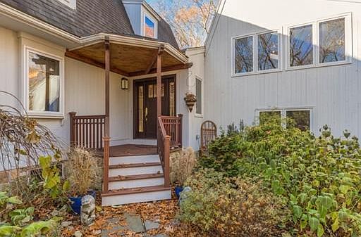 Decorative entry opens to an intelligently designed property of soaring spaces & intimate places, adaptable to many life-styles. Light spills in to illumine the thoughtful craftsmanship of this 3 BR, 2F/2H Bath home. A wall of glass accents towering fireplace brickwork, Cathedral ceiling & pegged wood floors in the step-down LR, with access to an expansive mahogany deck. 3-Season Sunroom, with Cathedral ceiling & fieldstone fireplace, serves as the gateway to outdoor living. Kitchen melds efficiency & beauty; warm natural wood cabinets, granite tops & a stunning curved serving table delineates Breakfast Room, with its wall of windows & exterior access. Convenient Ground-floor Master BR with Cathedral ceiling & skylights, has Bath w/radiant heat, ample closets and sliders to deck. An expansive, & lofty, FR w/ fireplace offers respite. Additional two BR on second floor, with a reading-nook off of the hall. Lower level hosts an Au Pair w/ kitchen and a surplus of space for use or storage.