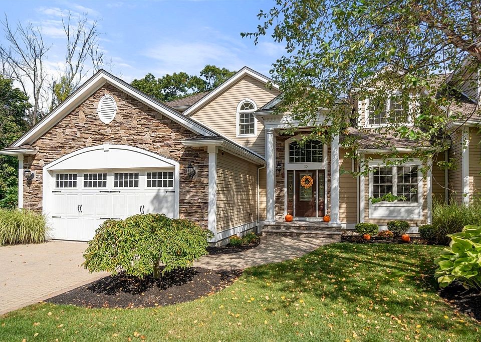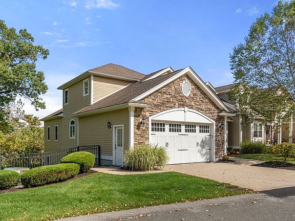 Elegant End Unit in Village Estates awaits you. This beautifully designed end unit is perfect for entertaining, featuring an open-concept first floor with hardwood floors throughout. The kitchen boasts custom cabinets, granite countertops, stainless steel appliances, and an oversized island. The living room offers soaring ceilings, built-ins, and a fireplace, with French doors leading to a sunroom with a gas stove and scenic views. The first-floor primary suite includes a spacious walk-in closet and en-suite bath. Upstairs, you'll find two large bedrooms, a full bath, and a versatile catwalk ideal for an office or reading nook. The expansive walkout basement adds even more living space with an office, gym, full bath, cedar closet, and a 29x22 entertainment area.
