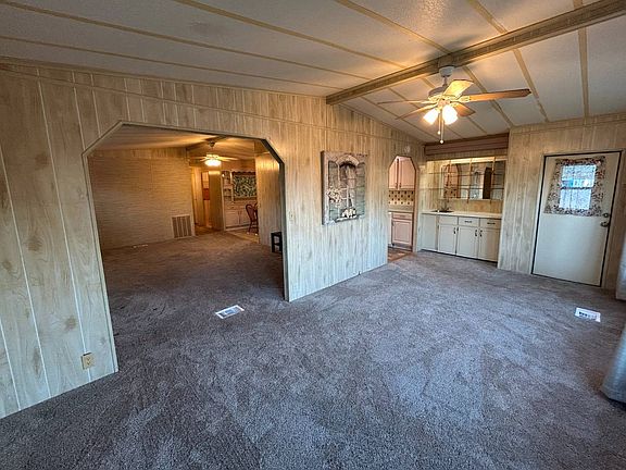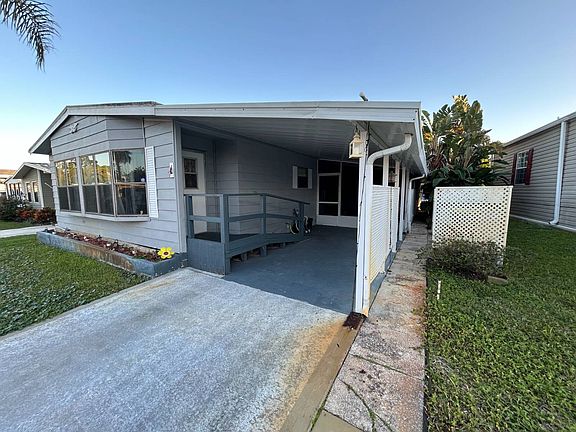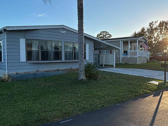 This spacious 2 bedroom, 2 bathroom home features vaulted ceilings and beautiful bay windows that fill the living room and primary bedroom with natural light. Recent updates include new carpet, new vinyl plank flooring, and a new refrigerator. The home offers a built-in china buffet, a convenient wet bar, and an inside laundry room with a utility sink. The primary suite includes a large walk-in closet, while the exterior features a durable metal roof, gutters, and a sprinkler system. Enjoy relaxing in the large screened-in porch or take advantage of the two attached storage rooms (11x13 and 11x8). A ramp provides easy handicap access, making this home both comfortable and practical. Located in Eastern Shores Village, one of the area's most desirable 55+ communities, the low lot rent covers water, sewer, trash, and resort-style amenities: heated pool, clubhouse, billiards, shuffleboard etc... This home is priced to move fast-thousands below comparable listings! Just minutes to the beach, the Intracoastal, shopping, and dining. Don't miss out on this incredible deal-schedule your private showing today before it's gone!