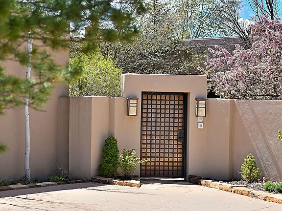 In the rugged reaches of exclusive Las Campanas this secluded estate—a sophisticated home and guesthouse—was custom-designed and -built amid blossoming trees, aspens, and stalwart evergreens. The residence is a bastion of color and volume featuring three luxuriously restful bedroom suites, formal living and dining rooms, a vast cook’s kitchen with a wet bar and a family room, an inviting guesthouse with a full kitchen and bath, and painstakingly landscaped grounds. Vibrantly colored polished plaster walls combine with soaring ceilings, wide windows, multiple fireplaces, a collection of portales, a roof deck, and a swimming pool shaded by a pergola to create an ideal setting for grand entertaining, a haven crafted for the appreciation of the outdoors, and the perfect venue for the display of art. Surrounding the home are natural greenery, carefully chosen landscaping, sculpture gardens, water features, and a water-wise artificial turf lawn.