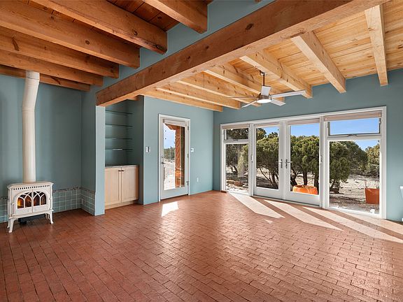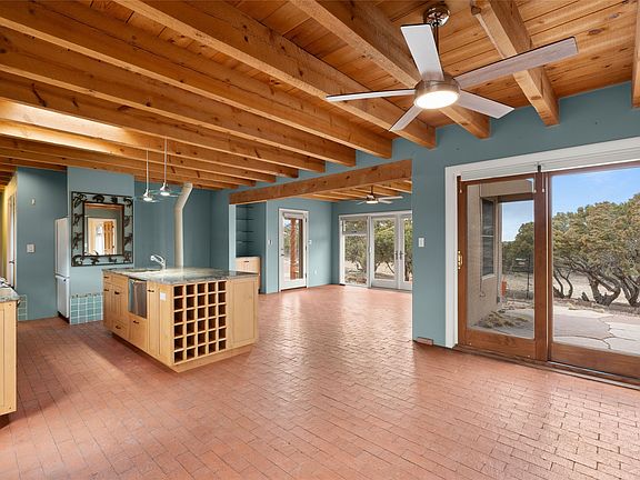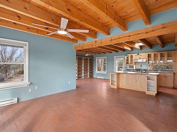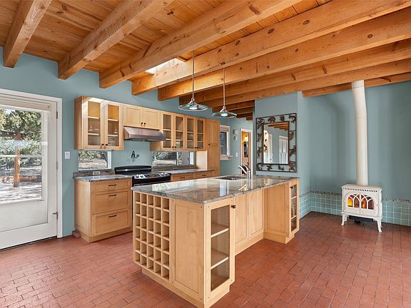 Looking for a studio or a casita? This darling passive-solar Eldorado home has a main house and a separate studio/casita. Solar panels on the main house, in-floor natural gas radiant heat in studio. Mountain views, greenbelt location steps from the trail and amazing star gazing from the hot tub. Main house has brick floors, two bedrooms and two baths, studio has concrete floors, one bedroom, 3/4 bath, large studio with built-in shelves, work sink and a separate room for a kiln. Updated kitchen with pretty cabinets, granite counters and an island with wine storage. Baths have also been updated. Beautiful and private setting. New PVC membrane roof with a lifetime warranty. New Navien boiler in studio. French drains collect rainwater in a 1,750 gallon cistern with a pump. Shared well with just one other property. NO STEPS, NO CARPET, NO KITEC, NO WATER BILL.