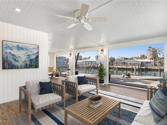 Beautifully renovated 3 bedroom, 3 bath canal front home with stunning mid-century modern curb appeal. ocated in Fairview Isles, a highly desirable boating and fishing community on the south end of Fort Myers Beach, and known for having the widest and deepest canals on the Island. Enjoy the convenience of a private boat dock and a unique “spool,” a compact pool with spa amenities. You will have peace of mind with storm protection that includes impact resistant doors and windows, a tightly strapped roof, anchored into a deep footing, and a concrete brick exterior. The fully electric, all weather shade screens on the lanai offer privacy and relief from the sun. The composite boat dock and professionally landscaped grounds enhance the home's Florida-chic curb appeal enhanced by the carport’s architectural plan, created by local architect, Albert Dambrose with Studio A.D. You may decide not to carry wind insurance; this roof will not succumb to the attempts of the wind to “blow this house down.” The tankless hot water heater adds to the “green” features of the house. In addition, this home features a brand new kitchen with a pantry, quartz countertops, tile back splash, and all new stainless steel appliances. All 3 bathrooms are fully equipped and tastefully remodeled. Enjoy extra storage in the full size laundry/beach room, perfect for projects and even a special puppy spa. Two additional storage facilities on the exterior of the property and an underground sprinkler system add additional value to your new home. In addition Fairview Isles requires no HOA fees; everything is done though voluntary contributions. This rare property has never been offered for sale until now. So don’t miss out. Raise the electric screens, which doubles your lanai floor space, and enjoy the uncovered paver area. This is no cookie cutter home; be prepared to be surprised by all this home has to offer.