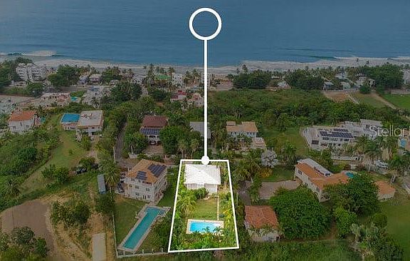 Located on one of the most sought after streets in the Puntas neighborhood of Rincon, this 2 unit property is less than 300 meters to world class surfing, beautiful beaches and the Sandy Beach area restaurants and activities. The main home is on the second floor, with a large covered balcony, 2 bedrooms (Primary suite has an en-suite bathroom) and a shared bathroom in the hallway plus open concept kitchen to living area with accordion style doors that open to the balcony with ocean views and breezes. The first floor is a 2 unit, 2 bath rental unit with full kitchen, large balcony and private access as well as garage access. The landscaped yard is just over 1,000 Square meters with room for another structure and features a large in ground swimming pool and fencing on the perimeter. This is a fantastic live-in and rent the 2nd unit or rent both, there are no restrictions. This is one of the most reasonably priced properties on this street where many the homes are valued over 2 million dollars