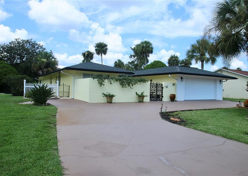 Rarely do houses like this come up for sale to own a stylish home backing up to the 13th tee of Palm Harbor Golf Club. Enter through custom wrought iron gates into a spacious courtyard—perfect for morning coffee. Inside, floor-to-ceiling windows and skylights offer stunning 180° views of the course and old oaks with water view. Built by Levitt/ITT, this is a 1900 sq foot 2-bed, 2-bath home which blends vintage charm with modern updates. Highlights include: Open floor plan with white tile and laminate floors, remodeled bathrooms with double vanities, stylish gray-and-white kitchen cabinets, ample closets and storage. Large lot with mature landscaping, oversized double garage with electric hurricane rated garage doors (110) No HOA. Close to European Village, Intracoastal Waterway, trails, shops, dining, and medical care. This is a prime Palm Coast location! Roof (11/2022) with oversized seamless gutters Water heater (2022) AC (4/2022) Electric Panel 6/2025 4 zone irrigation system Pavers that surround the house