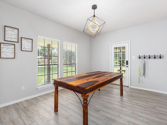 Beautiful country home on 1.4 acres featuring 3 bedrooms and 2.5 baths with an inviting open-concept design and soaring ceilings. The spacious living room boasts a floor-to-ceiling brick fireplace and expansive windows that fill the home with natural light. The kitchen offers custom cabinetry, generous counter space, an island, pantry, and breakfast area seamlessly connected to the living room—perfect for everyday living. The primary suite is a true retreat with double-door entry, dual sinks, and two walk-in closets. Secondary bedrooms are generously sized, each with a walk-in closet. A well-planned utility room includes a half bath. Outside, enjoy the expansive yard plus a shed for extra storage. The property also features a 2-car garage with an elevated slab, a work bench w/ a pegboard backing for organizing tools and a shed. An easement road leads to a breathtaking 30-acre private lake shared by only five properties, with deed restrictions in place to preserve its beauty and value.
