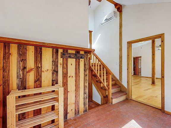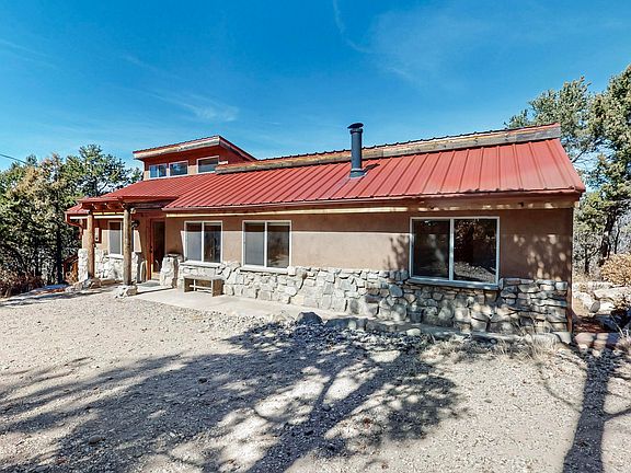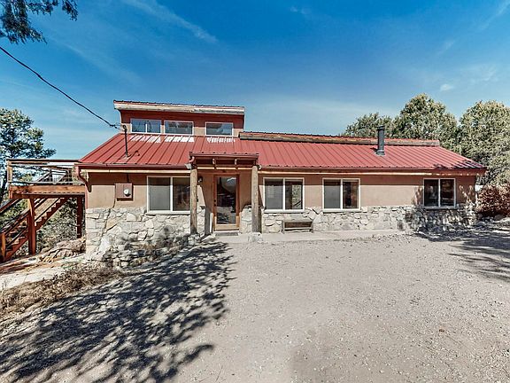Woodsey and Wow describes this charming cabin on a fully fenced .8 acre with views of the Sandias. Full southern exposure through large windows makes for a bright and airy interior. Large entry perfect for hanging coats and storing boots on brick floor. Gleaming pine floors in main living areas and bedrooms. Open great room with vaulted ceilings and a cozy wood stove. Sliding glass doors to deck from dining area. Kitchen with concrete countertops, lots of cabinets and storage stainless appliances. Primary bedroom is spacious and bright with walk in closet. Bath has double sinks and a tub shower with custom tile work. Second bedroom is upstairs with large private deck for even better views. Attached 3/4 bath. Bonus room downstairs with outside entrance, laundry closet,