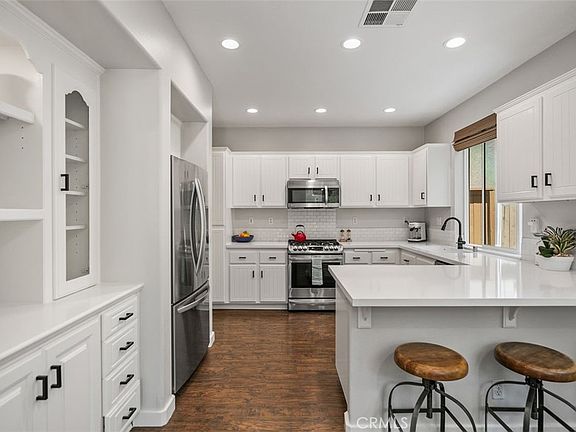 First Woodlands home on the market in more than a year! Tucked at the end of a private, single-loaded cul-de-sac in the desirable Woodlands tract of Westridge, this beautifully remodeled 3-bedroom home blends charm, comfort, and convenience in the heart of Aliso Viejo. The curb appeal starts with a sleek concrete paver driveway and continues inside with warm wood laminate flooring throughout. The cozy living room features custom built-ins, a fireplace with a hewn wood mantel and hexagonal tile surround, and opens into an updated white kitchen showcasing quartz countertops, subway tile backsplash, beadboard cabinets, matte black hardware, stainless steel appliances, and a built-in hutch with wine storage. The adjoining dining room connects both rooms seamlessly with a sunny breakfast nook featuring a built-in bench and cabinet, perfect for casual dining or weekend brunch. A stylish powder room completes the main floor with Mediterranean-patterned tile, plantation shutters, and a pedestal sink lit by charming vanity fixtures. Upstairs, the spacious primary suite has an en suite bath with ceramic tile flooring, dual-vanity, shaker-style cabinetry, and an open walk-in closet. Two additional bedrooms share a Jack & Jill bathroom with dual-vanity, tile floors, and plantation shutters. The extra-large backyard continues the elegant paver hardscape from the front, complemented by low-maintenance artificial grass and raised planters, perfect for outdoor entertaining or relaxing evenings at home. Additional highlights include full-home PEX repiping for peace of mind, extra storage cabinets in the garage, and a prime location just a short stroll to Westridge Park and highly sought-after Canyon Vista Elementary. This is a rare opportunity to own a home in one of Aliso Viejo’s most coveted neighborhoods. Schedule your private tour today!