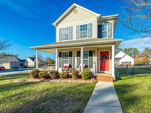 Step inside to discover a thoughtfully designed open floor plan featuring plenty of natural light, gleaming hardwood floors, comfortable living spaces, and a warm, welcoming ambiance. The spacious upstairs master suite offers a private retreat, featuring ample room for both relaxation and functionality. It includes a generous walk-in closet and an en-suite bathroom, providing both comfort and convenience. Adjacent to the master suite are two additional well-sized bedrooms, perfect for family, guests, or a home office. Each bedroom has plenty of closet space and easy access to a full bathroom, ensuring privacy and comfort for everyone. Outside, the wraparound porch invites you to relax and unwind, while the fenced side yard is perfect for pets or entertaining.