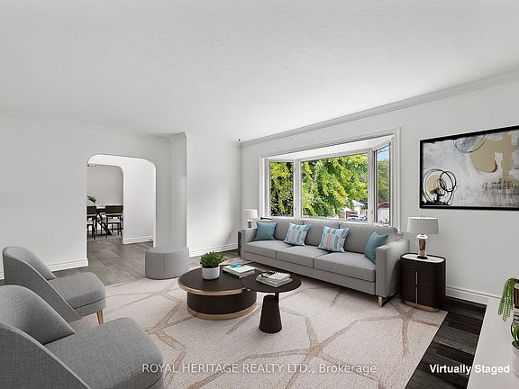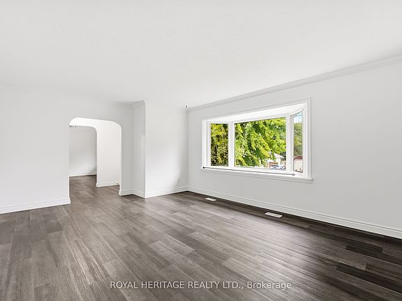 Detached brick bungalowElegant archwaysCrown mouldingDark wood-look laminate flooringLarge bay windowFormal dining roomCrisp white shaker-style cabinetry