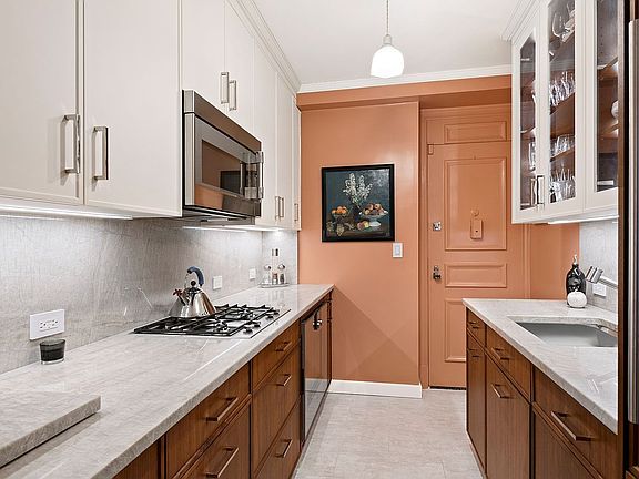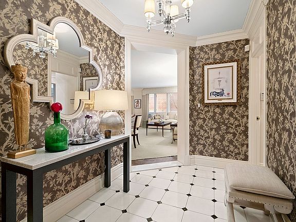 This oversized and airy residence has been thoughtfully re-envisioned with attention to every single detail. With charming tree-top views and southern light it feels like you are on a high floor! This pristine home features a formal entry foyer, two seating areas, and an ample dining room; the stunning spacious primary bedroom suite offers huge floor-to-ceiling closets and an en-suite renovated full bath with glassed in shower, the second bedroom, currently configured as a large library with home office and guest bed, also comes with its own en-suite bath with shower and tub. Convenient washer dryer in unit, plus a large basement laundry available if needed. The stunning powder room is elegant and fun. The handcrafted gourmet kitchen features custom cabinetry, true quartzite countertops, brand new Bertazzoni stove and Gaggenau oven, plus tons of beautiful built-ins, as well as a service entrance for your hand-delivered mail and packages.
