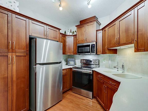 Functional u-shaped kitchenUpgraded hardwood floorsStainless steel appliancesDesigner window coveringsLarge private balcony