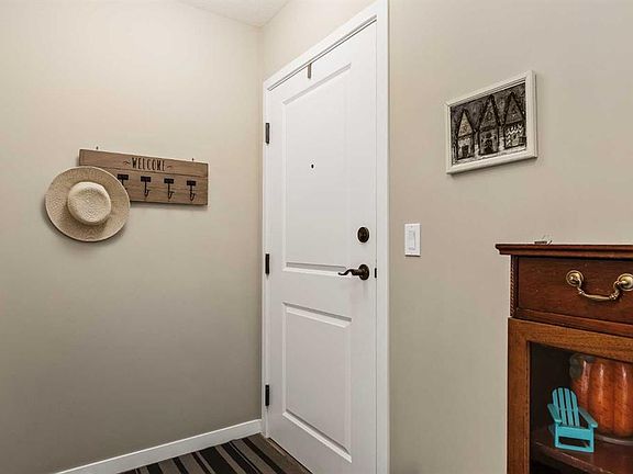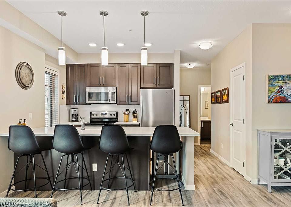 Welcome to Sandgate at Mahogany Lake. This custom built south east facing corner suite offers air conditioning and a private 36 by 6 foot deck that captures the sun throughout the day. The open concept layout features a bright living room with four large windows overlooking the courtyard and a stylish kitchen with quartz countertops, upgraded cabinets, a peninsula island, and premium stainless steel appliances. Two bedrooms and two full bathrooms are located on opposite sides of the living space for privacy, each with organized closet cabinetry. Residents enjoy exceptional amenities including a 1300 square foot fitness centre, a welcoming common area library, and two comfortable guest suites for visiting family and friends. Additional features include nine foot ceilings, luxury vinyl plank flooring, concrete construction, extra storage, and titled underground parking. All of this is set within award winning Mahogany, where you can enjoy year round recreation at Calgary’s largest lake along with walkable access to Mahogany Village Market with its shops, cafés, and restaurants including Sobeys, Tim Hortons, State and Main, and the renowned Chairman’s Steakhouse.