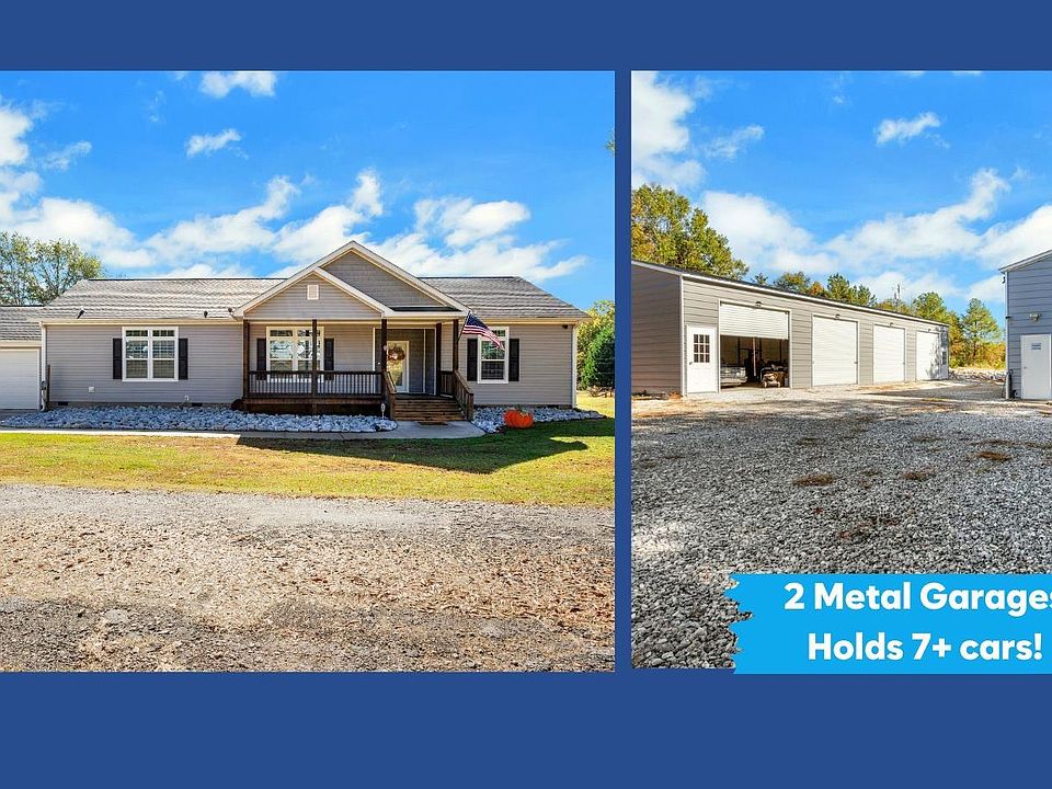 Sought after Blue Ridge 2.27 acres located in the MOUNTAIN VIEW ELEMENTARY School District! Gorgeous 1 level home built in 2018 offers over 1900 sq ft, above ground pool with big deck and 2 METAL GARAGES THAT WILL HOLD 7+ VEHICLES IN ADDITION TO THE 2-CAR ATTACHED GARAGE! This is NOT YOUR ORDINARY PROPERTY and is perfect for any CAR ENTHUSIAST or your own work from home shop! The home offers a large open floor plan that makes entertaining easy. The living room features COFFERED CEILING and a STONE WOODBURNING FIREPLACE. The kitchen boasts large FARM SINK, COFFERED CEILING, STONE & ARCHWAY surrounding the range, and large WORK ISLAND & BREAKFAST BAR. The primary bedroom boasts BARN DOORS, DUAL VANITIES, GARDEN TUB, SEPARATE SHOWER and a huge walk-in closet with CUSTOM BUILT IN CABINETS. Large deck surrounding the above ground pool and overlooks the firepit. The 2 buildings consist of: 30x60 building, 4 bays with 10x10 rollup doors and one bay is divided. The second building is 30x40, 3 bays with 10x10 doors and offers water and power. Car lift, air compressor, washer & dryer, furnishings in house are negotiable.