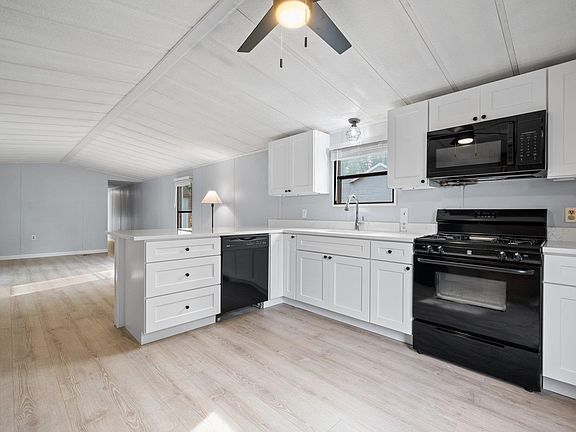 *Seller says bring offers!* Look at this kitchen! This freshly updated and affordable home in this Resident Owned Community is ready for its next owner. Brand new roof with 50 year warranty is just one highlight, as the new Shaker style hardwood kitchen with white granite counter tops are accented by new maintenance free flooring and modern light fixtures. The countertop overhang on the peninsula is a perfect transition to sit and eat and also enjoy the large living area. Notice the virtually staged living room, feel free to copy! Follow the newly installed flooring and notice the window treatments and fresh light grey paint down the hallway to see the first bedroom with plush carpet on the left, the large full bathroom with new fixtures and finally the primary bedroom, also virtually staged. Don't forget the large, covered front porch and 8x8 outdoor shed! Showings begin Sunday 9/22/24 via ShowingTime or call agent directly. Possible seller financing available for down payment assistance