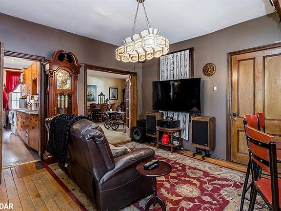 Welcome to 10 Eplett Street, a piece of Coldwater's history beautifully reimagined for modern living. Built circa 1890 & featured on the Historical Walking Tour, this timeless home blends old-world charm with today's comforts. Original hardwood floors, wood doors, and high ceilings complement the spacious kitchen with pine cabinetry, resilient flooring, and an airtight wood stove. Flowing seamlessly from the kitchen, the formal dining room is filled with natural light from large windows, 9-foot ceilings, and a walkout to the inviting front veranda. French doors open into the family room and wet bar, where reclaimed pine plank floors, custom lighting plus 3-piece bathroom create a space perfect for entertaining. The upper level continues the home's story with four generous bedrooms, including one in the original "maid's quarters" with a separate staircase and cedar-lined closet. A bonus loft with cathedral ceiling offers a private reading nook or creative retreat. The updated bathroom combines vintage charm with modern comfort, featuring dual sinks, and a shabby chic vanity. Set on a premium lot with the original barn & drive shed, a children's play fort & mature trees, this property offers space and serenity. Located in the heart of the Village of Coldwater, known for its welcoming spirit, boutique shops, riverside trails, and rich heritage. Windows (2014), Gas Furnace (2013), Newer Roof (2021/2023).....A truly rare find ~ "history meets heart" at 10 Eplett Street!!