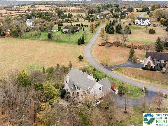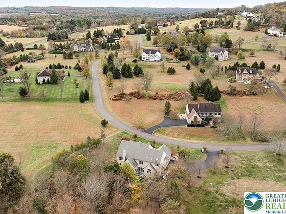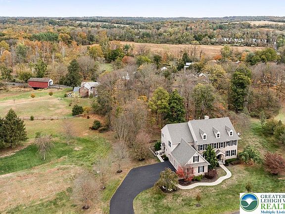 Set on a quiet cul-de-sac in Tinicum Township’s sought-after Rolling Hills community, this 4,638 sq ft executive-style home offers graceful country sophistication and modern comfort. Lofty 9 foot ceilings on all three levels, rich oak floors, tall doors and detailed millwork create an elegant design. The welcoming foyer is a grand greeting room with turned stairs, and is flanked by the formal living room and the dining room with wet bar butler pantry. The chef’s kitchen with granite counters, newer stainless appliances, walk-in pantry, and breakfast room flows into the family room with vaulted ceiling, skylights, and wood-burning stone fireplace. French doors lead to the Trex deck and paver terrace below—ideal for entertaining. The first-floor study provides the perfect home office and has a private Trex deck. Upstairs, the primary suite features a sitting area, large boutique-style walk-in closet, and spa bath with jetted tub and walk-in glass shower, double vanities and WC. Three additional bedrooms include one en suite. The hall bath has a double vanity. The 9' unfinished basement offers expansion potential; pre-plumbed for a bath and studded walls are in place. 3-car garage with mudroom entry, whole-house generator, propane heat, and sound system complete the offering. On 2.44 serene acres with views of the Erwinna covered bridge and access to walking trails, the Delaware River and the Canal State Park. 40 min to Lehigh Valley, 90 min to NYC, 75 min to Philadelphia.