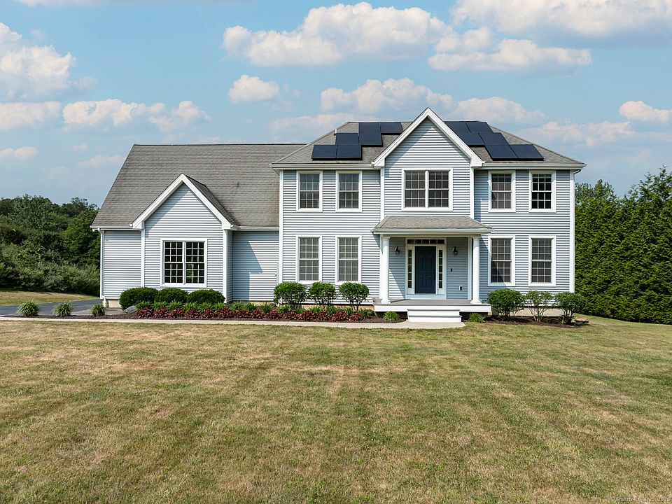 Absolutely stunning 4 bed, 4.5 bath, 4.172 sq ft colonial set on 3.94 private acres with breathtaking pond views in a quiet, tree-lined subdivision, near beaches, shopping & dining. This move-in ready home features a new geothermal heating system, newly renovated KIT, and brand-new 15 kW owned solar panels for energy efficiency. Enjoy a spacious layout with formal living room, first floor office with French doors, elegant dining room w/crown molding & chair rail, and an eat-in kitchen w/maple cabinets and pantry, new appliances, granite counters, island & tile backsplash that opens to a cozy family room w/propane fireplace. A sunroom w/vaulted ceiling, skylight & slider access to rear Trex deck delivers unbelievable views. The massive primary suite features coffered ceilings, huge walk-in closet & private office/nursery. The luxurious spa-style bath includes dual vanities, jetted tub, skylight & large shower stall. The upstairs also boasts a 2nd ensuite bedroom w/full bath & walk-in closet, 3rd bed, full hall bathroom, separate laundry room & a walk-up attic. The newly finished full walkout basement adds a large family room, the 4th bedroom & another full bath-ideal for guests or multigenerational living. Additional highlights include New geothermal heating and cooling system, generator hookup, new water filtration system and an oversized 2-car garage. Enjoy access to the association pond perfect for fishing & kayaking. VA Assumable mortgage of 2.65% to any approved VA buyers